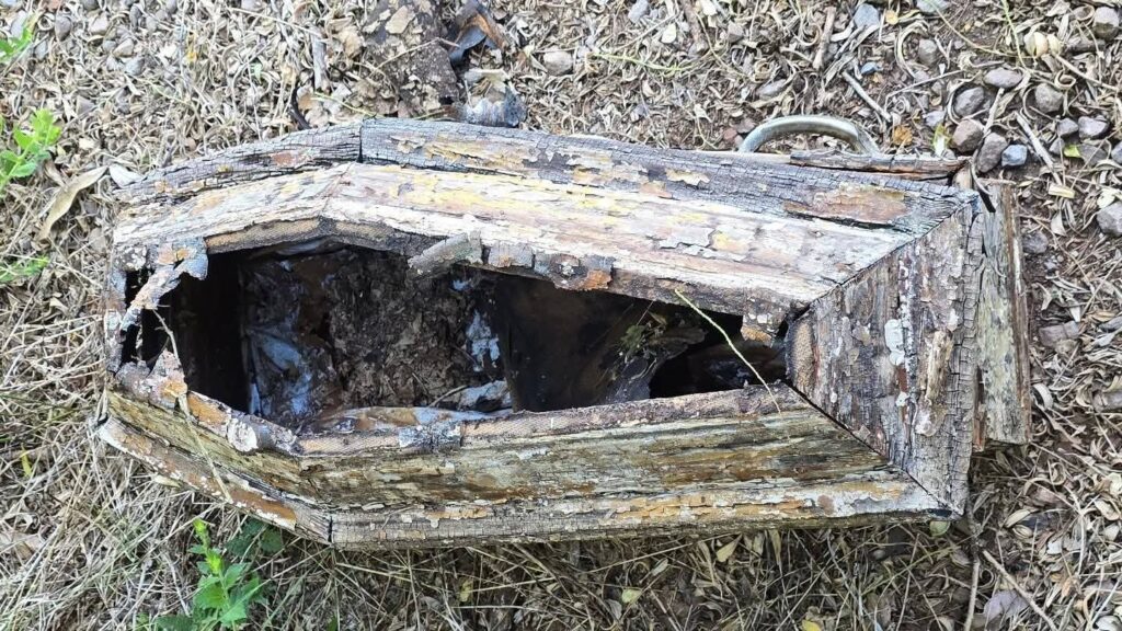 No local, foi constatado que o caixão estava violado e apresentava sinais visíveis de desgaste provocado pelo tempo, principalmente na parte superior da estrutura. Apesar da situação, não havia qualquer indício de corpo ou restos mortais nas proximidades, o que inicialmente descarta a presença de material humano no interior ou ao redor do objeto.