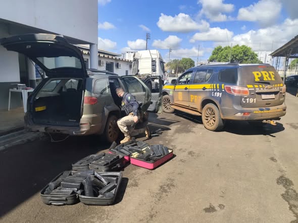 Na vistoria do veículo, os PRFs encontraram diversos tabletes de maconha, que, após pesagem, totalizaram 101,6 quilos da droga. Em consulta aos sistemas, foi constatado que as placas estavam adulteradas e que o carro possuía registro de furto ocorrido em Cascavel no ano de 2026.