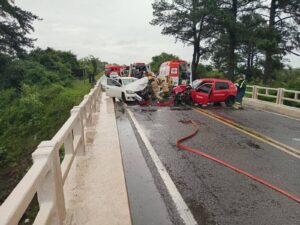 A tarde de domingo, 16 de novembro, foi marcada por um acidente de características complexas na localidade de Passo do Verde, área que divide Santa Maria e São Sepé. A chuva contínua reduziu a visibilidade e deixou a pista escorregadia, criando o cenário em que dois veículos, um VW Voyage de Dom Pedrito e um Renault Clio de Florianópolis, acabaram se chocando diretamente sobre a ponte do Rio Vacacaí, ponto conhecido pelo tráfego intenso e pela dificuldade de manobra em dias de instabilidade.
