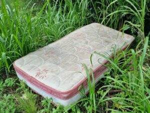 Ao longo do acostamento, são visíveis sofás, estofados, colchões, pneus e partes de mobiliário residencial, como móveis desmontados, gavetas, portas e chapas de compensado. Em uma observação mais detalhada, já dentro da vegetação, aparecem garrafas de vidro, garrafas PET, tubulações plásticas e metálicas, além de resíduos da construção civil, como pedaços de concreto, pedras e restos de tijolos.
