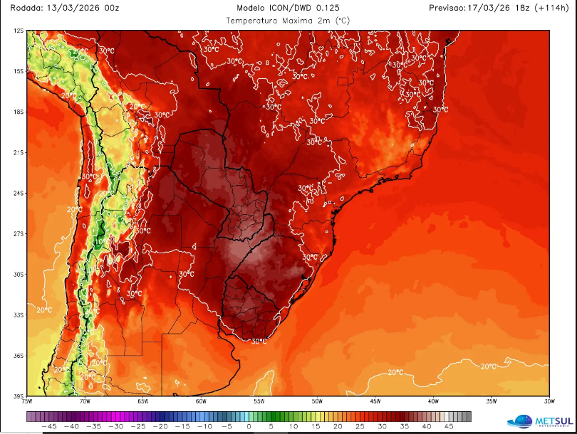 A MetSul Meteorologia emitiu um alerta para um período de calor excessivo no Rio Grande do Sul nos últimos dias do verão astronômico. A previsão indica temperaturas muito acima da média climatológica de março em diversas regiões do estado.