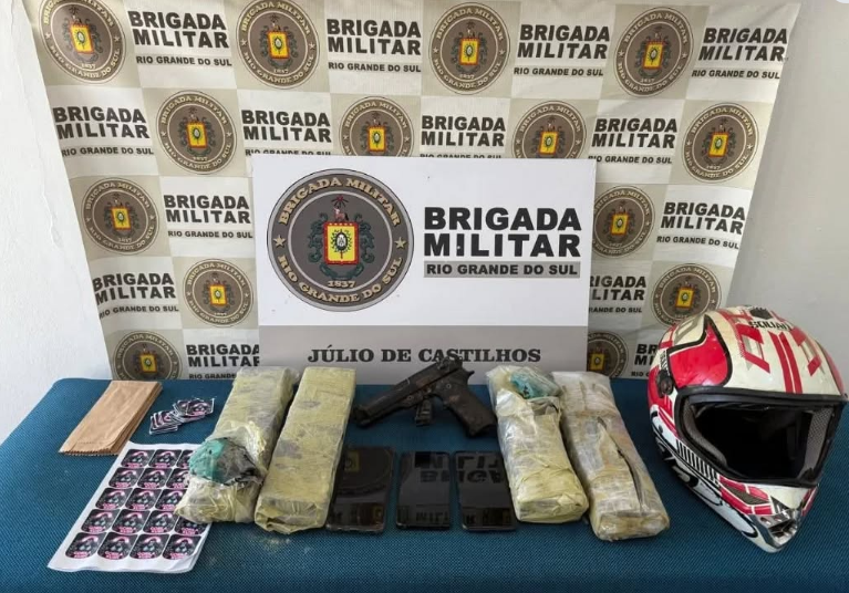 As equipes da Brigada Militar monitoraram o local e realizaram a abordagem no momento em que a encomenda era recebida pelos suspeitos. Na revista, foram apreendidos quatro tabletes de substância semelhante à maconha, um simulacro de arma de fogo e diversos invólucros que seriam utilizados para fracionar e comercializar a droga.