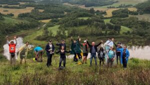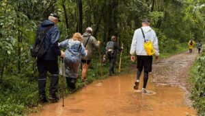 Mesmo sob chuva e neblina, o grupo manteve o ritmo e percorreu o trajeto até a conhecida ponte quebrada. De lá, seguiram por uma trilha em meio à natureza até o topo de um morro, onde foram presenteados com uma vista panorâmica da paisagem, marcada pelas águas que cortam o cenário e pelo clima contemplativo proporcionado pela garoa.