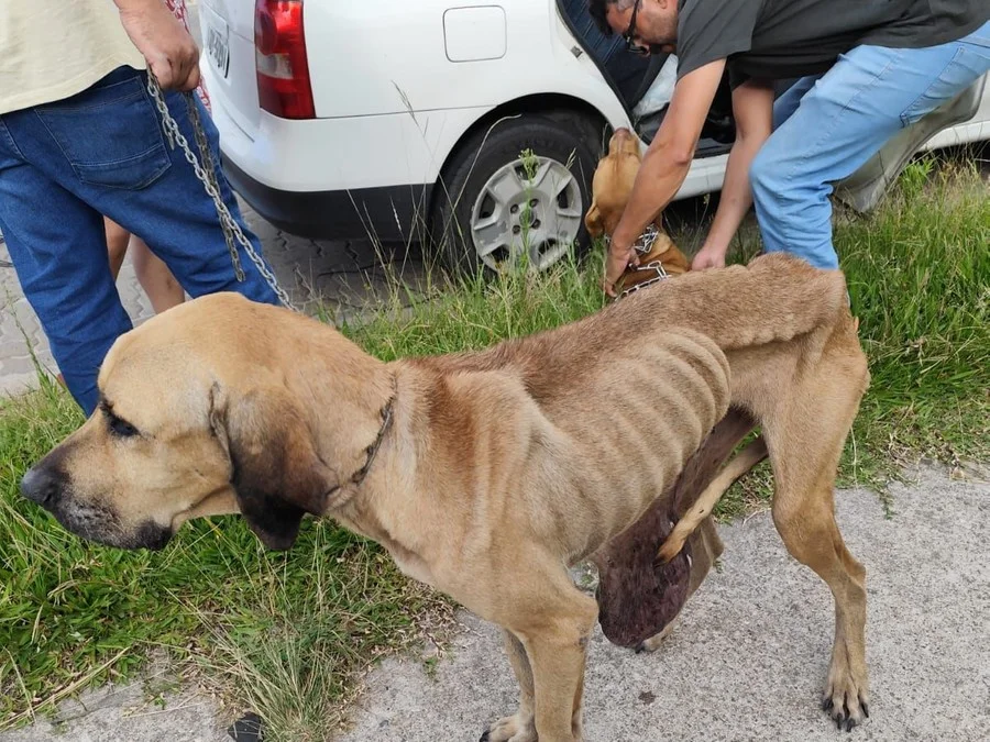 Por uma fresta do portão da residência, os agentes visualizaram uma cadela de grande porte, da raça fila, extremamente magra e com um tumor de grandes proporções na região inferior do abdômen. No interior do imóvel, foram encontrados outros dois cães: uma cadela de porte médio com um tumor de grandes dimensões na cabeça, que deverá passar por procedimento veterinário especializado, e uma cadela da raça pitbull, que será encaminhada para adoção responsável após avaliação clínica.