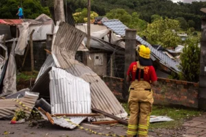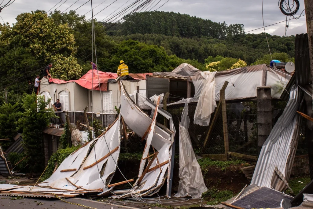 Um violento temporal com características de tornado atingiu a região de Farroupilha no início da tarde desta terça-feira (23), deixando um cenário de destruição, especialmente na comunidade de Vila Rica. A intensa ventania provocou destelhamentos em larga escala e causou danos significativos a imóveis públicos e residenciais, incluindo a Escola Municipal de Ensino Fundamental José Chesini.